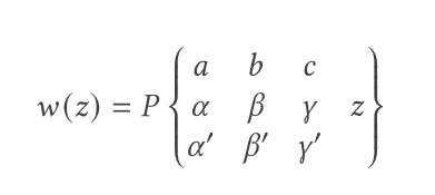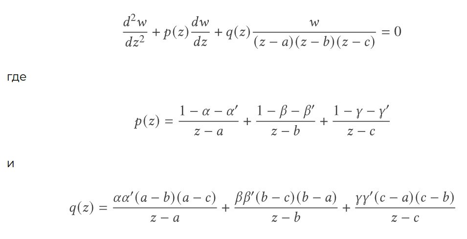 Прежде чем записать дифференциальное уравнение Римана (рис. 2), отметим, что оно имеет регулярные особые точки в точках a, b и c. На самом деле это его отличительная особенность: это наиболее общее линейное дифференциальное уравнение второго порядка с тремя регулярными особыми точками. Параметры a, b и c входят в уравнение как корни выражения в знаменателях — так и должно быть, если это особые точки.