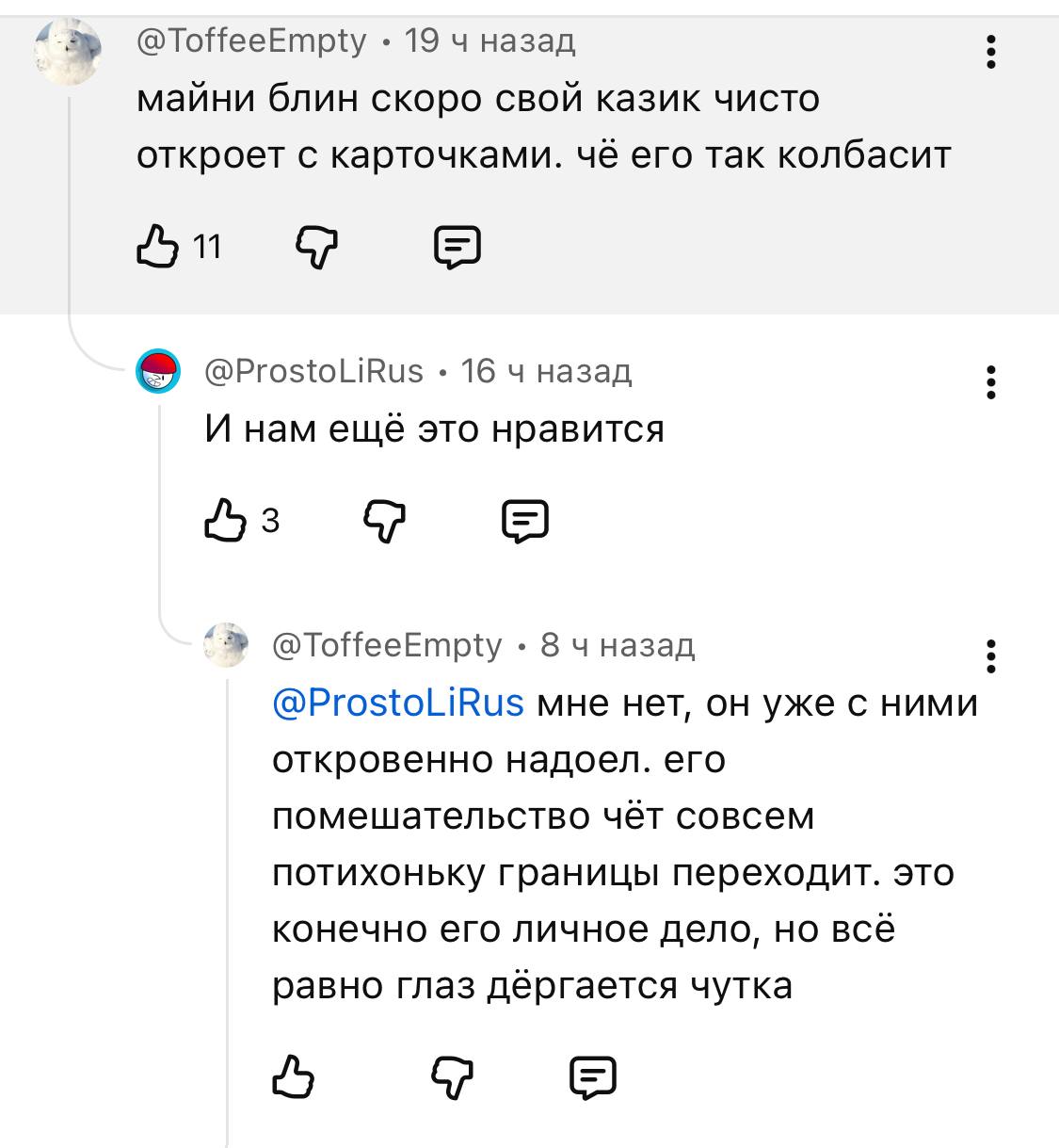 Лично я не могу понять, как мое хобби может мешать человеку, если даже на тех же реакциях, я о карточках если и вспоминаю, то чаще в контексте шутки и это занимает 0.1 процент хронометража.