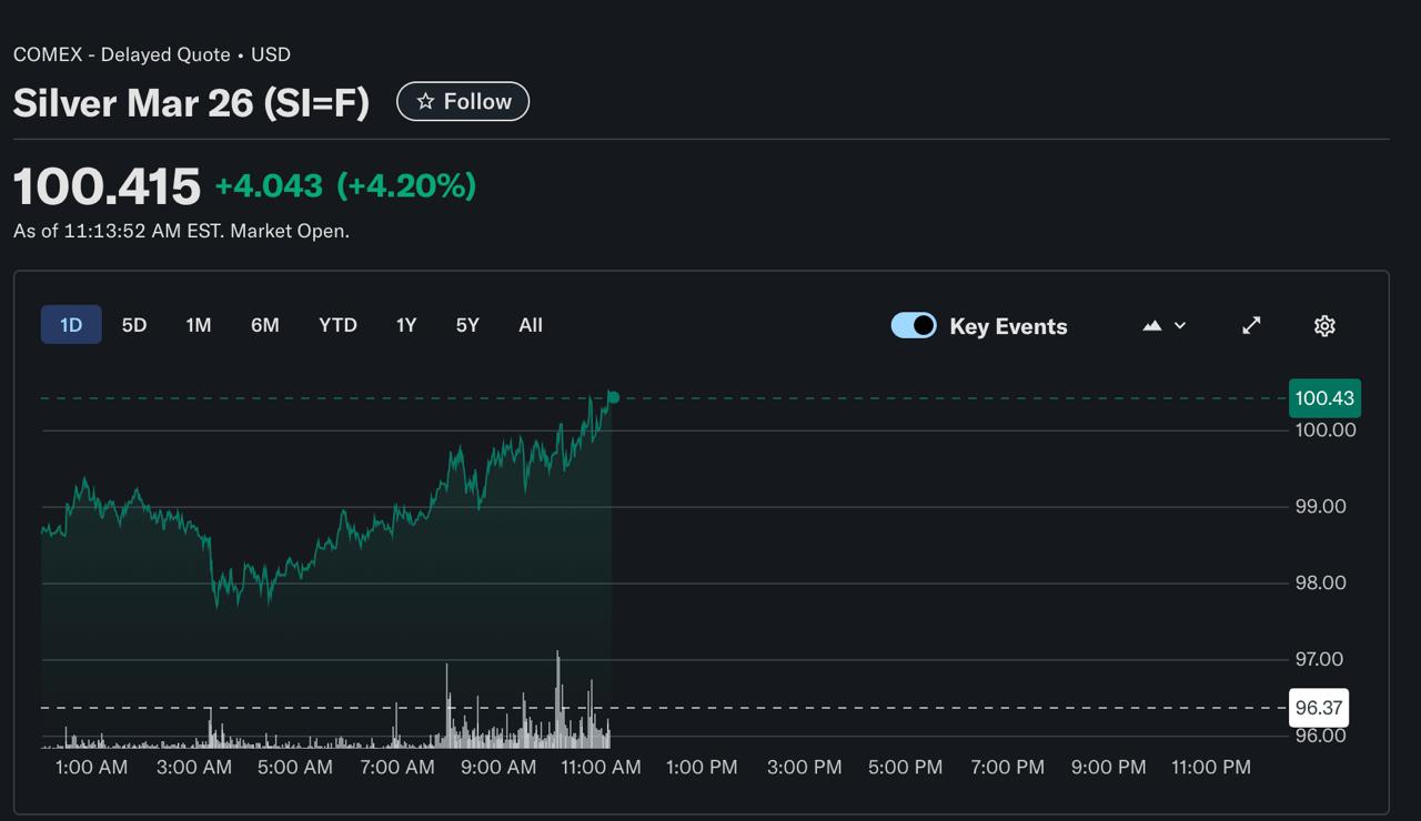 Серебро подорожало до 100 долларов за унцию Цена на серебро впервые превысила отметку 100 долларов, продолжив стремительное ралли, начавшееся в декабре 2025 года, пишет Bloomberg. Серебро в течение торгов подорожало на 4,38% до 100,6 доллара, следует из данных биржи COMEX. В то же время золото также поднялось до нового рекорда, приблизившись к отметке в 5000 долларов за унцию. Фото: Yahoo Finance @meduzalive