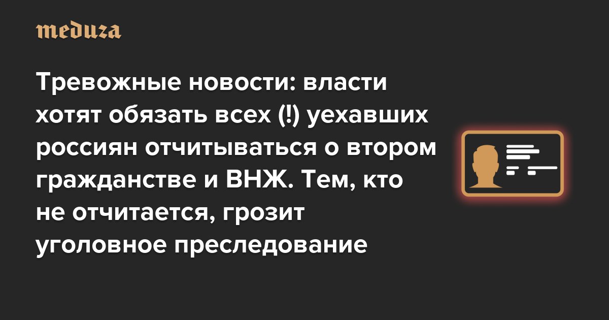 Власти хотят обязать уехавших россиян уведомлять о втором гражданстве и ВНЖ. Чем грозит отказ? МИД предложил обязать всех россиян, которые живут за пределами страны, уведомлять посольства и консульства РФ о наличии у них второго гражданства или постоянного вида на жительство. Неисполнение этого требования, по замыслу дипломатического ведомства, должно караться по Уголовному кодексу РФ. Инициатива тревожная: вряд ли российские власти вышли с подобным предложением из добрых побуждений. Однако чрезмерно тревожиться тоже не стоит: во-первых, даже предусмотренная за подобное «преступление» уголовная ответственность пока не предусматривает реального лишения свободы; во-вторых, если такой закон и будет принят, то заработает он не раньше 2028 года, а с учетом переходного периода — 2029-го. Отвечаем на главные вопросы об инициативе МИД в нашем разборе. Открыть с VPN | без VPN @meduzalive