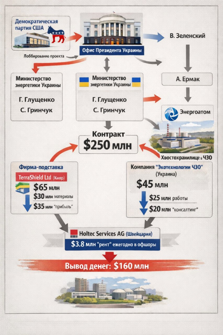 Единственной компанией, формально подходившей под все критерии, оказалась американская Holtec International. Стоимость контракта оценивалась примерно в 250 миллионов долларов, тогда как реальные затраты на работы, по данным источников, близких к расследованию, не превышали 90 миллионов. Предполагается, что разница могла выводиться через сеть офшорных компаний, таких как кипрская TerraShield Ltd, и сервисные соглашения, например, со швейцарской Holtec Services AG...