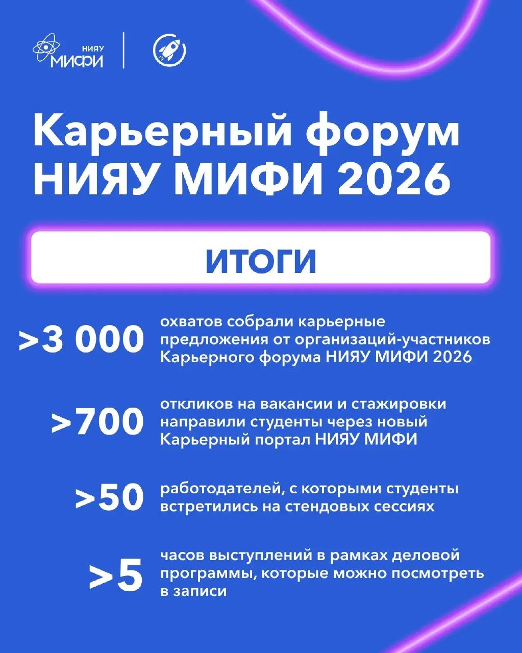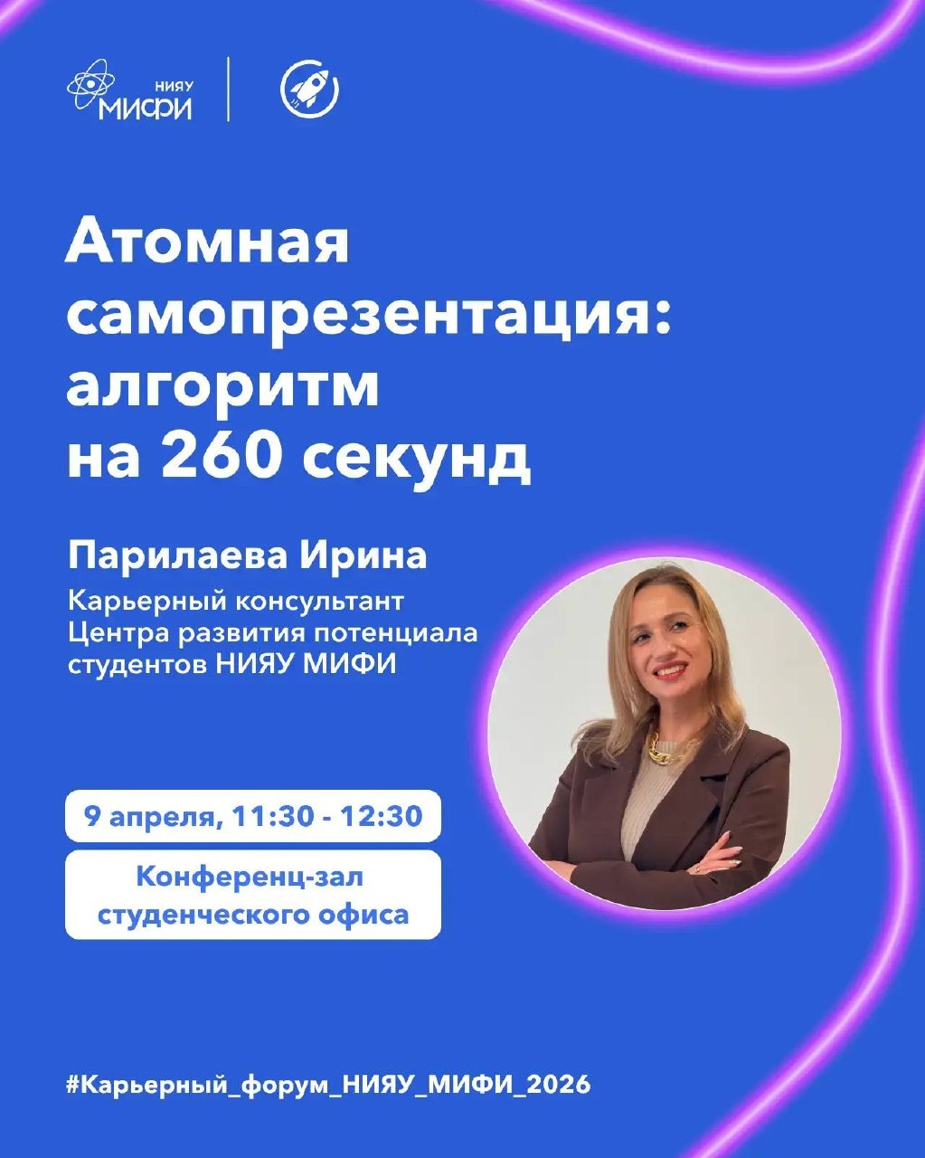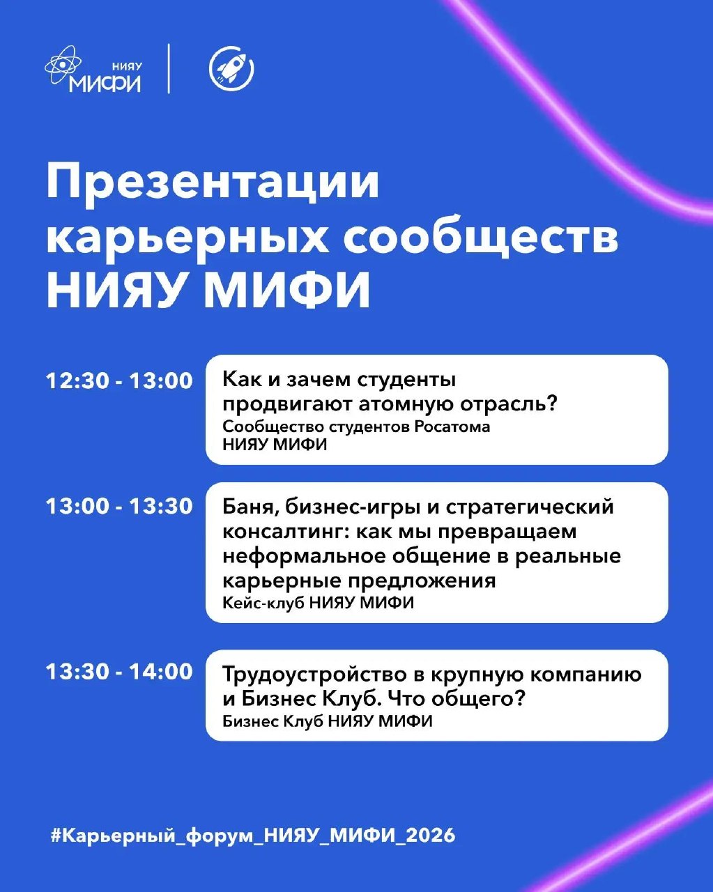 Участвуй в финальных активностях, зарабатывай баллы и сдай свой буклет с 13:00 до 14:00. Приходи в 15:00 в конференц-зал студенческого офиса, где мы объявим топ-30 победителей и вручим им подарки от партнеров Карьерного форума НИЯУ МИФИ 2026.