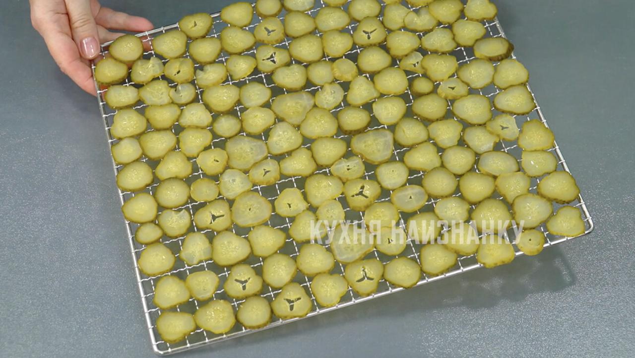 Затем выкладываю нарезанные огурцы на сетку и ставлю в сушилку для овощей.