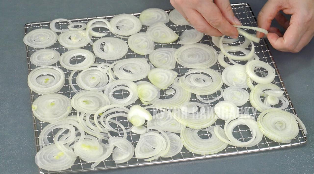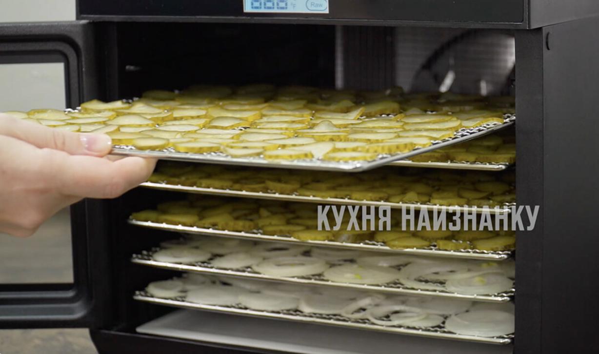 Кроме огурцов в сушилку отправляю также лук. Он мне понадобится для моей чудо-приправы. Устанавливаю температуру 60 градусов. Сушу, пока все овощи не высохнут. Обычно в моей сушилке это занимает примерно 6 часов.
