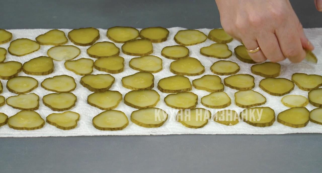 Солёные или маринованные огурцы (какие остались) нарезаю толщиной примерно 3 мм. Выкладываю на бумажное полотенце, сверху накрываю ещё двумя листами полотенец и "просушиваю" кружочки огурцов.