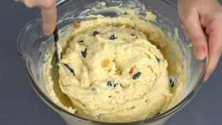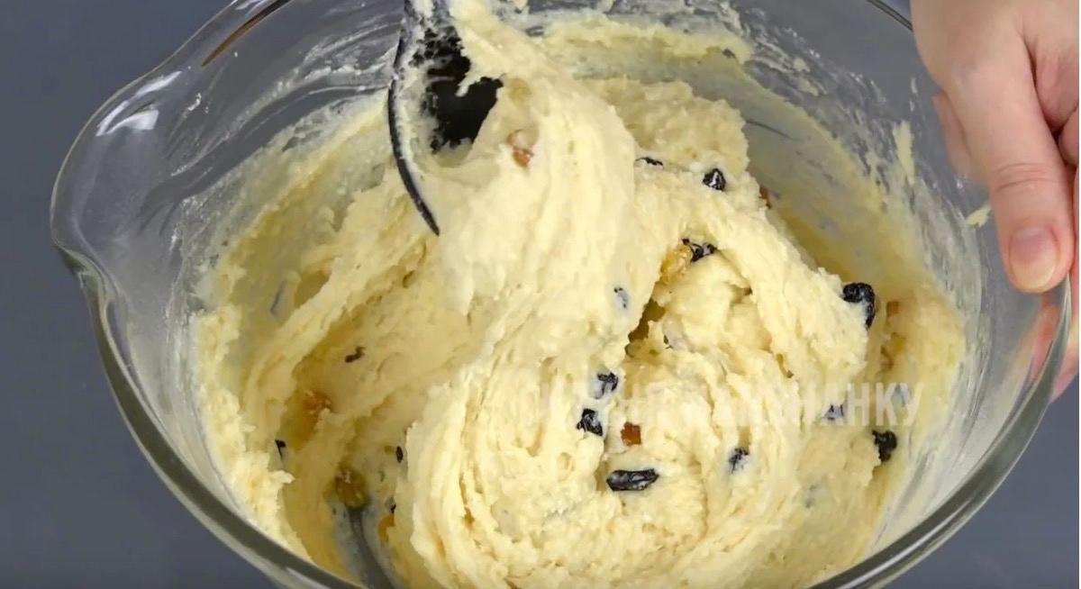 Добавляю просеянную муку с разрыхлителем и подготовленный изюм. Перемешиваю. Изюм добавляю в муку, поэтому предварительно я его в муке не обваливаю. Лишние движения))