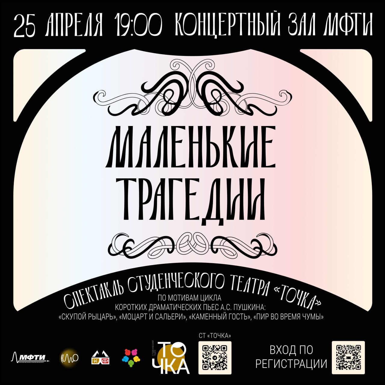 На сцене концертного зала МФТИ цикл произведений А.С.Пушкина «Маленькие трагедии». В эту субботу СТ «Точка» проведёт нас через четыре одноактные пьесы, в которых Александр Сергеевич выразился не только как искусный поэт, но и как чуткий философ, изобразив многочисленные и многообразные проявления жизни.