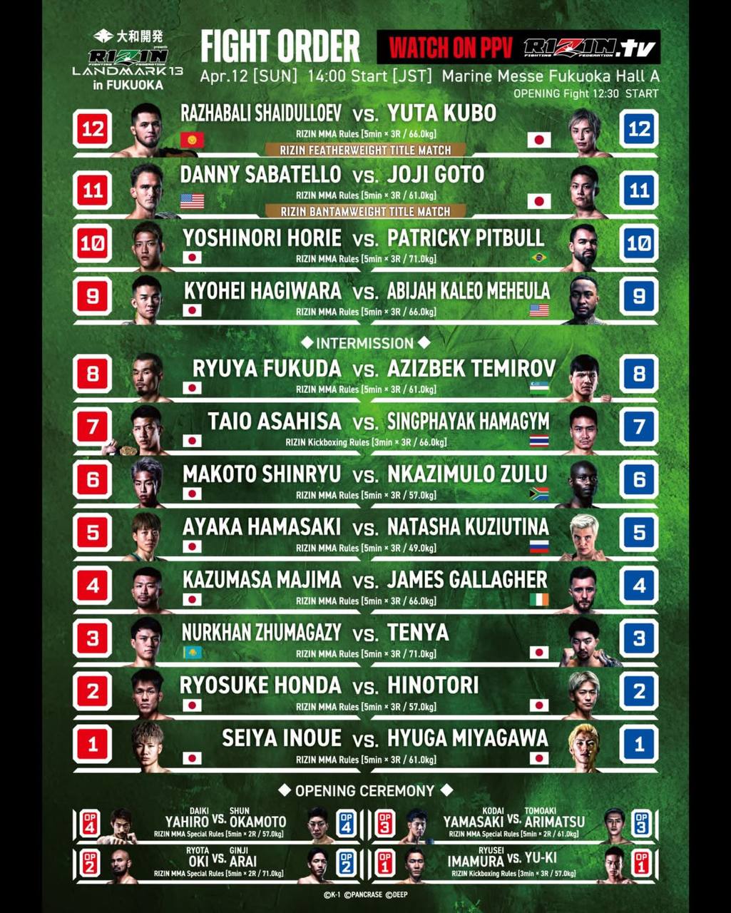 Ражабали Шайдуллаев 19-0 в первом раунде техническим нокаутом побеждает Юта Кубо 5-3, в весе до 66 кг, на ”RIZIN Landmark 13” в Японии.