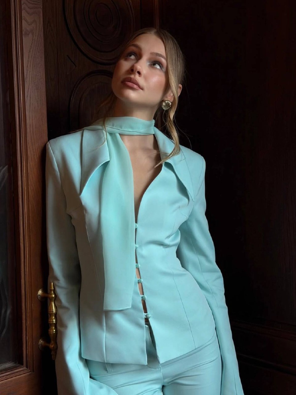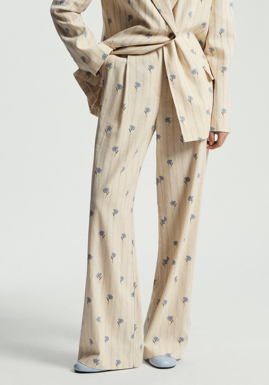 Нежный брючный костюм с цветочным принтом для легких весенних образов. Добавьте к нему голубую обувь или сумку – они будут отлично перекликаться с принтом.