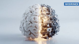 Abstract 3D form of a cat divided into two halves: one side made of realistic human organic texture, the other side made of glowing circuit lines and chips, joined in the center, on a clean gradient background, high-end CGI look, sharp central focus, clear message of human intelligence inside AI loop
