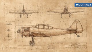 hand-drawn technical blueprint of a small 1940s aircraft, showing three schematic views (top, side, front), vintage engineering paper background, pencil and ink sketch style, visible measurements and component outlines, retro aviation design, aged parchment texture, no text or labels