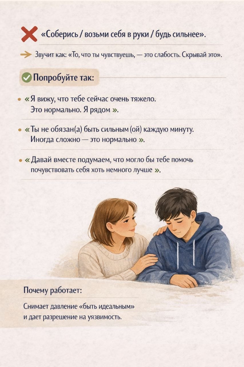 ❗️Мы часто хотим поддержать подростка, но случайная фраза может ранить сильнее, чем кажется. Помните: подростку важнее всего чувство принятия. Когда он говорит о проблеме, он чаще не ждет от вас готового решения. Он ждет фразу: «Я тебя слышу и не осуждаю».