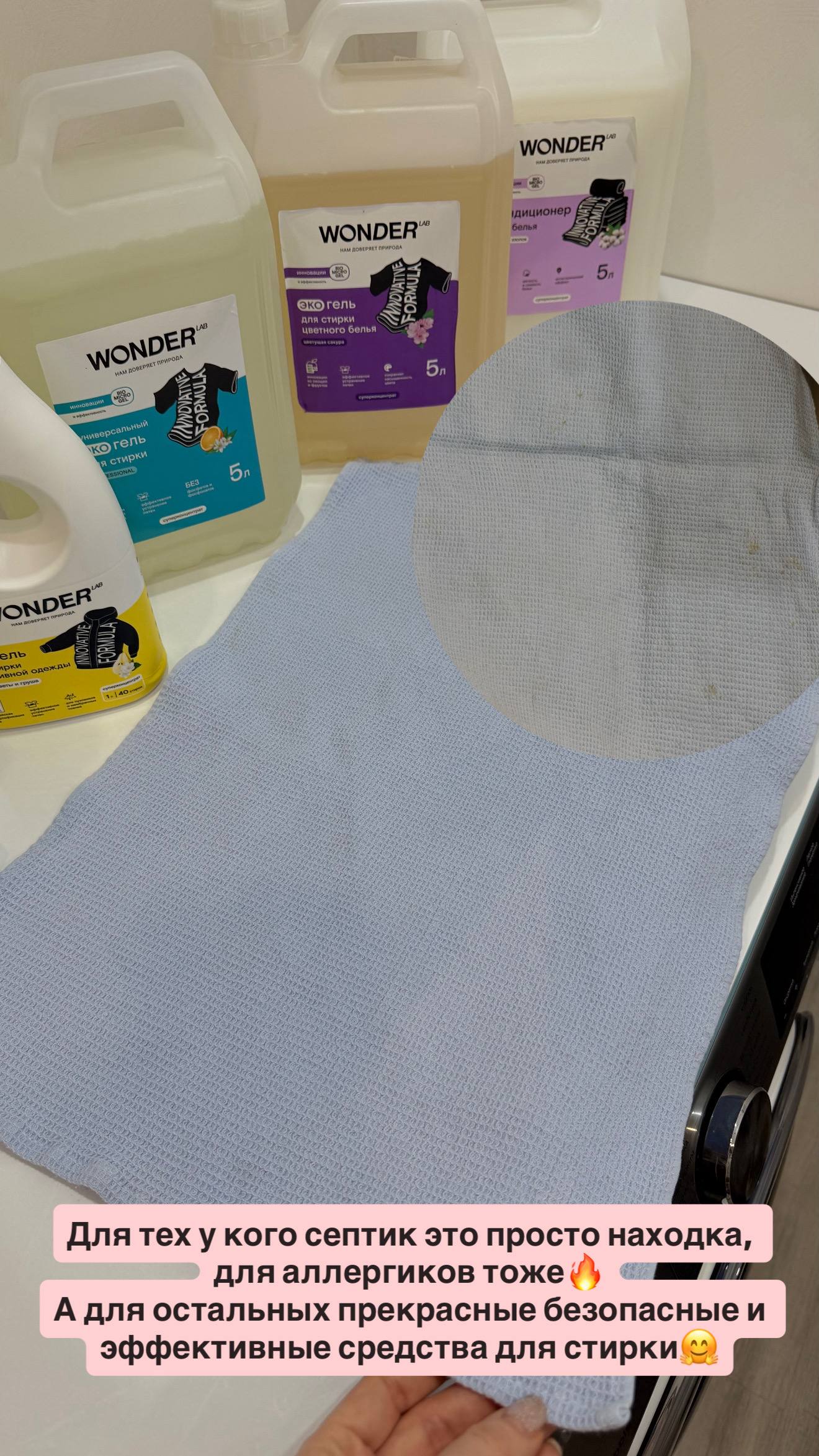 В итоге идеально подошла линейка WONDER LAB - у них главный компонент Биомикрогель. Это натуральный компонент, выжимка из овощей и фруктов. Он безопасен для природы и разлагается на 98% в течение суток. Он усиливает моющую способность, помогает лучше выполаскиваться из тканей, дает антистатик-эффект🔥 И отлично, что есть абсолютно всё от детского шампуня до гелей для стирки. Вот про них сегодня и рассказываю.