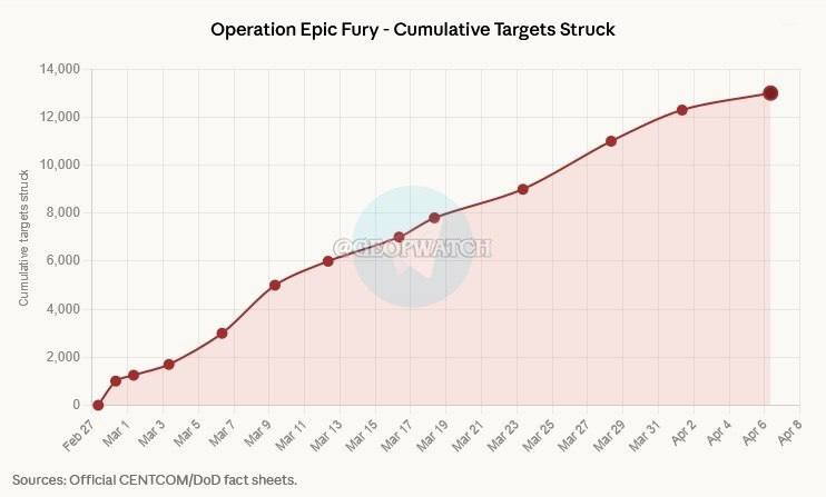 Средняя частота ударов за последние 36 дней составляет 360 целей в день, по сравнению с 1000 за первые 24 часа. Только за последние 5 дней частота ударов упала до 140 целей в день, хотя эта цифра, вероятно, искажена операцией по поиску и спасению в Иране (CSAR).