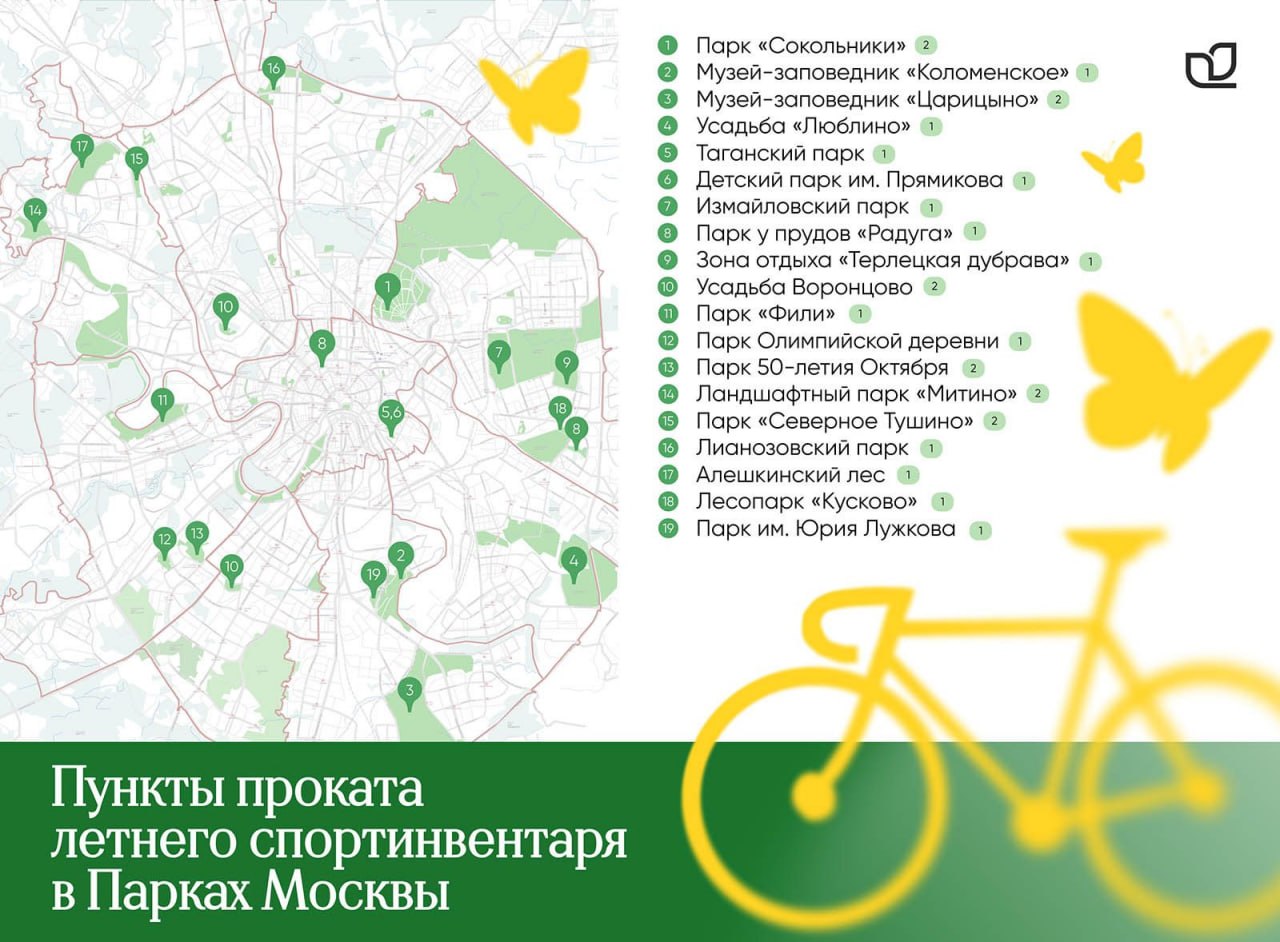 📌 В Измайловском парке тоска проката находится на Северной площади, рядом с деревянной эстрадой и танцполом. В аренду можно взять велосипеды, веломобили, фэтбайки и детские электромобили. Общая протяженность велодорожек здесь составляет более 20 километров.
