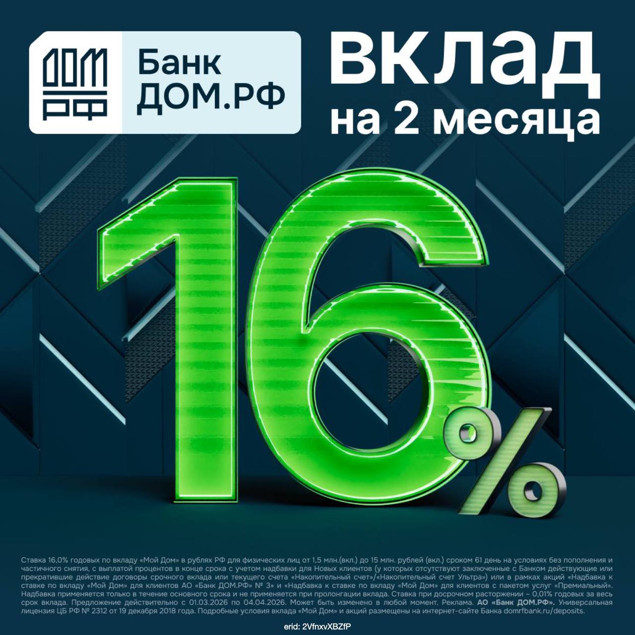 Банк ДОМ.PФ, входящий в число системно значимых банков страны, представил вклад с доходностью 16% годовых на срок 2 месяца для новых денег от 1,5 млн ₽, без пополнения и снятия, проценты в конце срока.