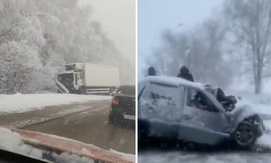 Серьезное ДТП на снежной дороге в Подмосковье у Зарайска.