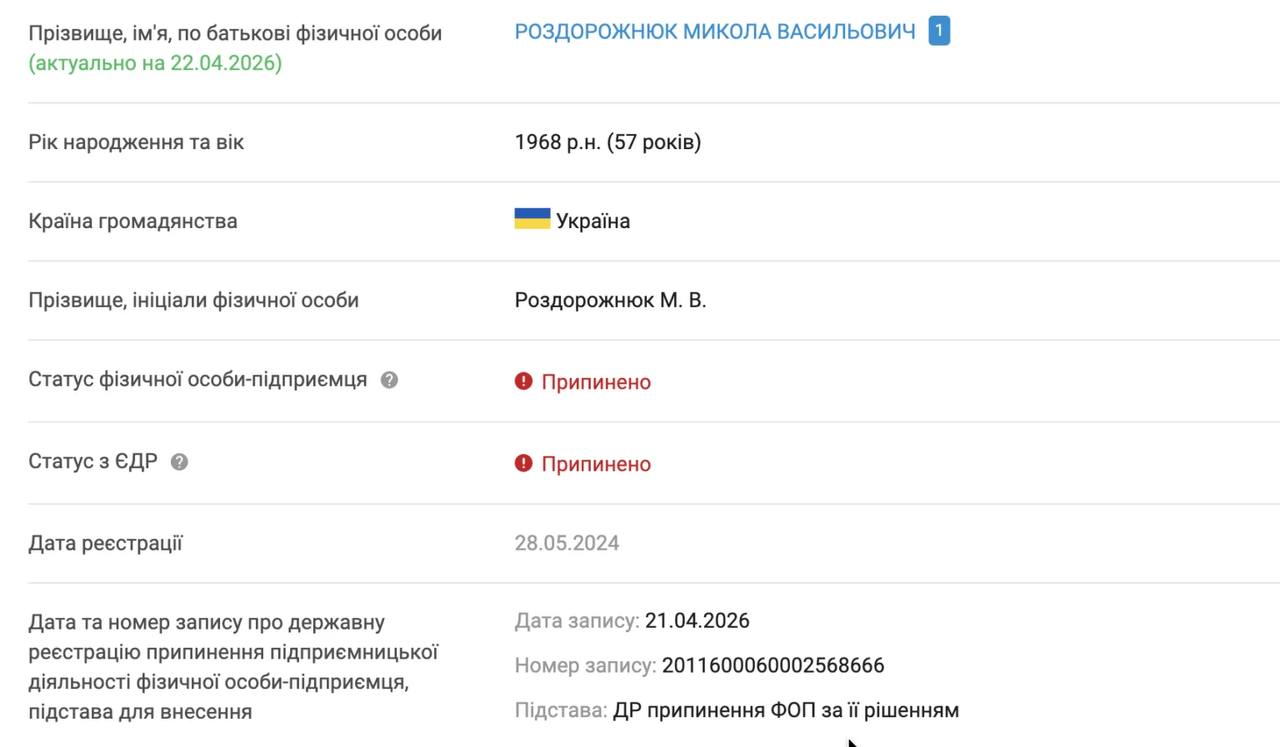 👤Підприємець зі Степанівки Микола Роздорожнюк, який мав постачати антидронові сітки департаменту Херсонської ОДА, 21 квітня припинив діяльність.