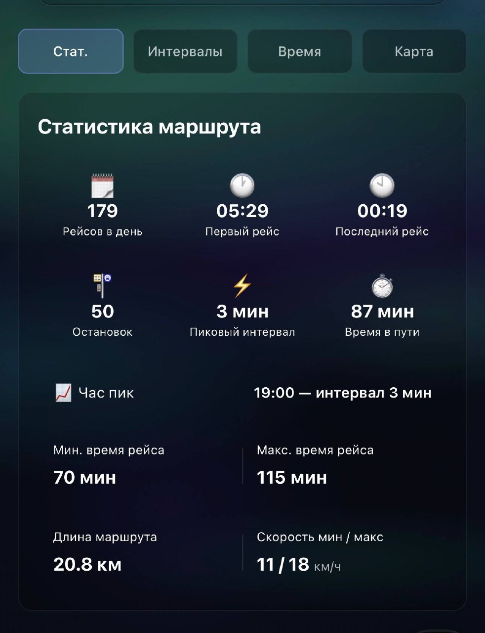 И да — теперь видно что автобус 10 едет со средней скоростью 14 км/ч, а трамвай 3 — 11. Пробки в цифрах.
