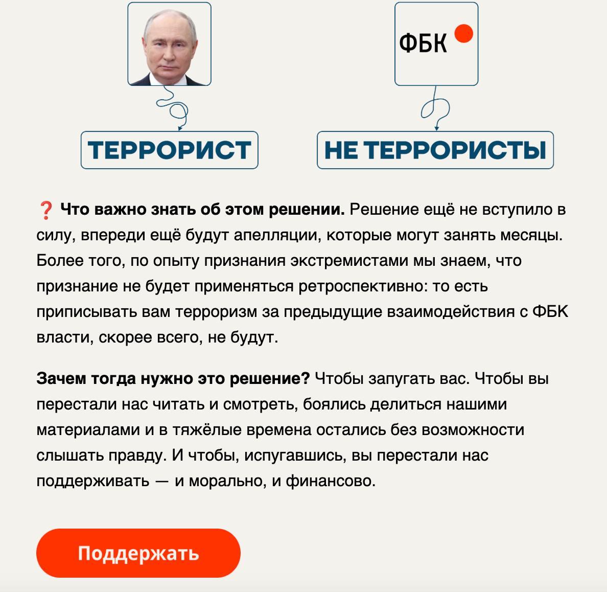 📣В заявлении в ответ на вердикт суда ФБК успокаивает сторонников: решение ещё не вступило в силу, впереди апелляции, а власти якобы не будут ретроактивно приписывать «терроризм» за прошлые донаты и взаимодействия. И предлагает продолжать донатить и увеличить помощь, указывая как безопасные донаты в криптовалюте с ротацией кошельков. На днях Юлия Навальная призвала россиян, помимо прочего, писать ей письма.