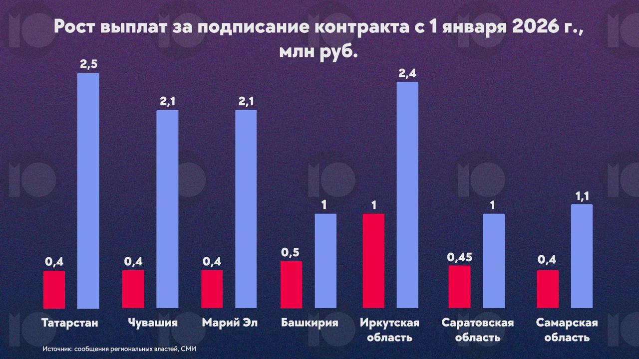 🪖💸 В январе семь российских регионов увеличили выплаты за подписание контракта – они выросли в 2-5 раз. Осенью шесть из них резко снижали эти бонусы