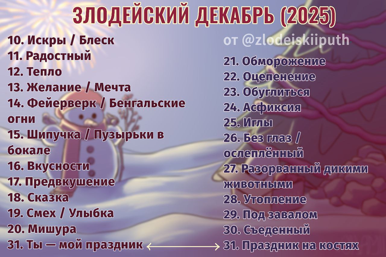 Каждый день с 10 по 31 декабря — новая тема для творчества. Можно делать что угодно: рисунок, зарисовку, фанфик, стих, видео, поделку и т.д. Главное — не выкладывать заранее, только в сам день темы или позже.