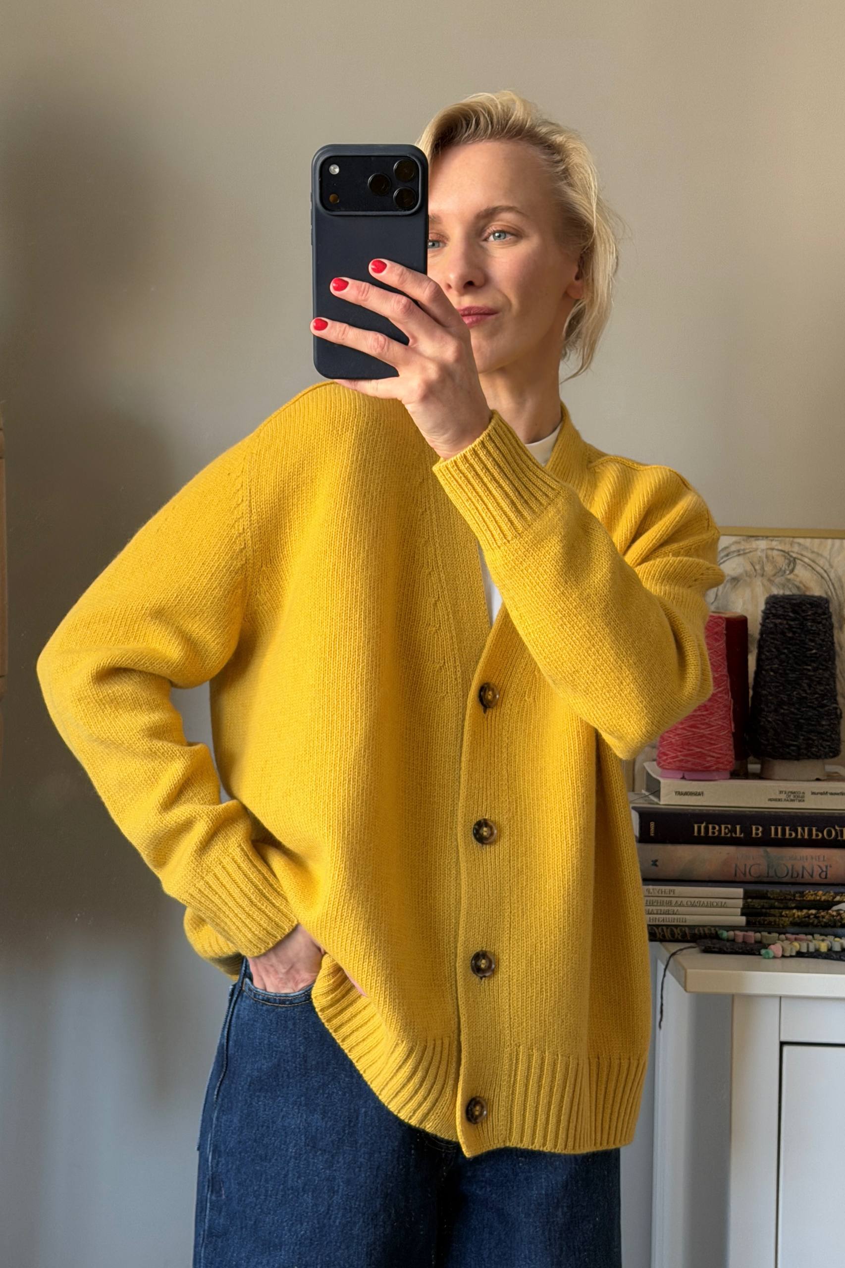 🌿Во-первых, это укороченные кардиганы, связанные резинкой, под горло, на пуговках. Один вы уже видели в сером цвете. Сейчас вяжем их в других, более ярких оттенках.