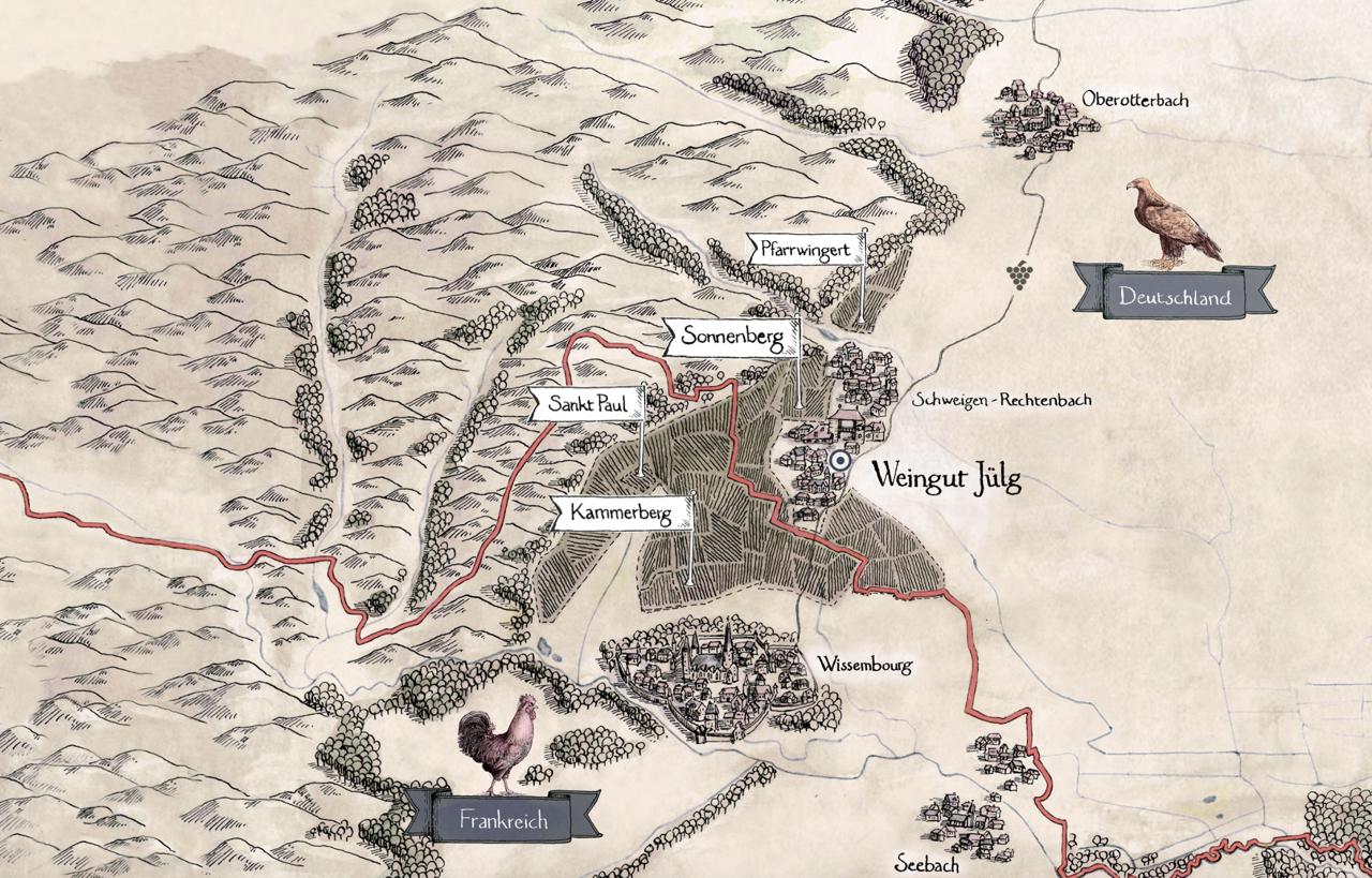 Виноградник Sonnenberg от производителя Weingut Julg имеет статус гран крю в Германии. Но некоторые парсели, например, Wormberg находятся в другой стране. И из-за этого казуса вино с этого участка технически не может иметь уровень Grosse lage, так как в Эльзасе такого статуса у него нет.