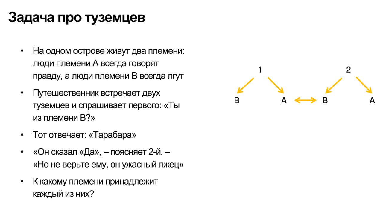Это загадка из курса «Тренировка ума: как прокачать логику, внимание и креативность». Курс я прошел целиком, мне понравилось. Ведет его Виктор Горбатов, философ и логик, который много лет преподавал в ВШЭ и 10 лет подряд получал награду «Лучший преподаватель». По лекциям это сразу чувствуется: объясняет не скучно, дает неожиданную практику и заражает интересом к теме.