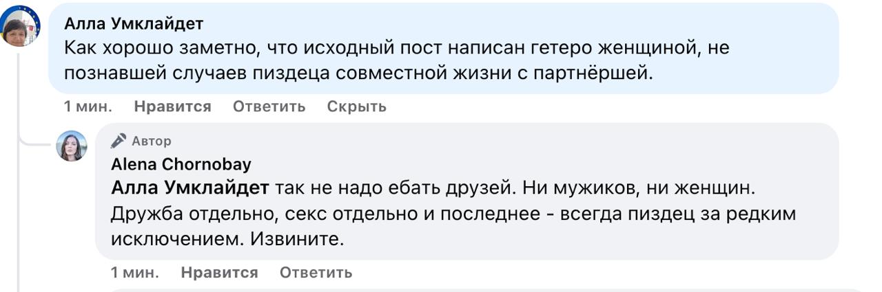 Мне так часто говорили, что нет женской дружбы, что пару раз едва ль не поверила. Но это неправда. Дружбы, может, и нет. Вот этой, поверхностной – встретиться, выпить. Ты поправилась, постарела, у тебя седина, а Люська-то опять помирилась с Виталиком. Но если Виталик уйдет, хлопнув дверью, мать сломает ногу, у тебя найдут пиздецому, жизнь развалится на осколки, уволит начальник, ограбят, изнасилуют, отнимут всё – женщины встанут стеной, проверено.
