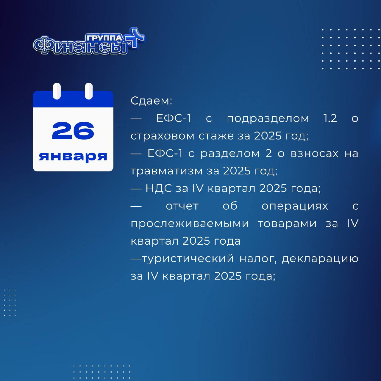 ⏩ туристический налог, декларацию за IV квартал 2025 года;