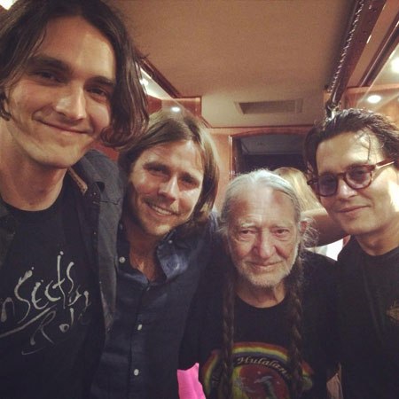 Джонни Депп вместе с Вилли Нельсоном и его сыном Лукасом Нельсоном за день до неожиданного появления на концерте в в Blue Hills Bank Pavilion в Бостоне (США) в качестве приглашённого гостя.