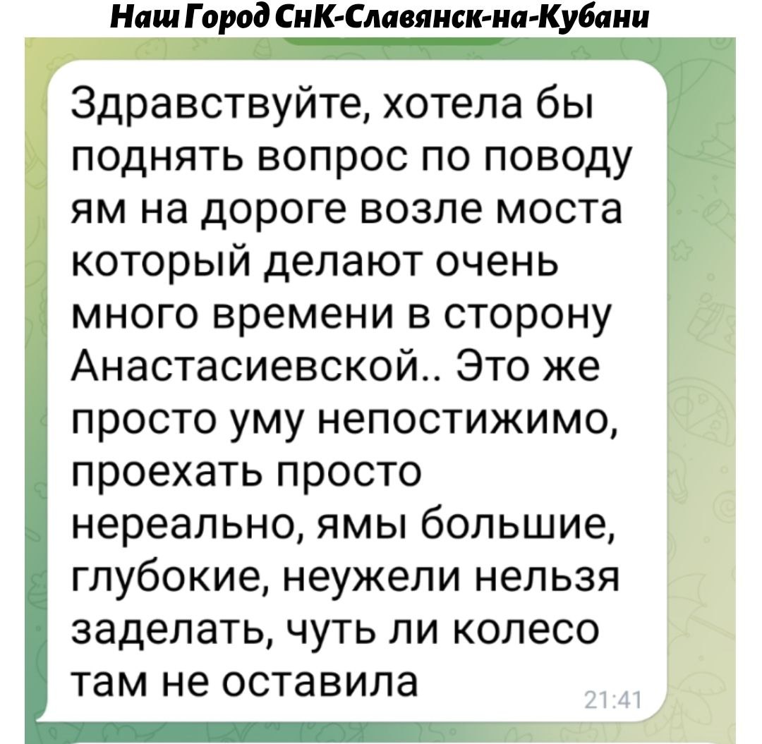 "Здравствуйте, хотела бы поднять вопрос по поводу ям на дороге возле моста который делают очень много времени в сторону Анастасиевской.. Это же просто уму непостижимо, проехать просто нереально, ямы большие, глубокие, неужели нельзя заделать, чуть ли колесо там не оставила"