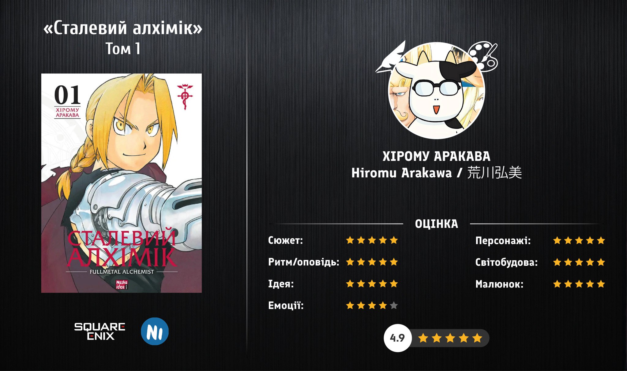 Є серії, які входять у історію попкультури не як «ще один тайтл», а як щось шедевральне. А перший том «Сталевого Алхіміка» одразу нагадує, чому навколо нього стільки легенд, цитат і тихих зітхань фанатів. Це старт історії, що вміє бути легкою, майже веселою пригодою, водночас тримати під ребрами холодок від думки: за кожен крок тут виставлять рахунок.