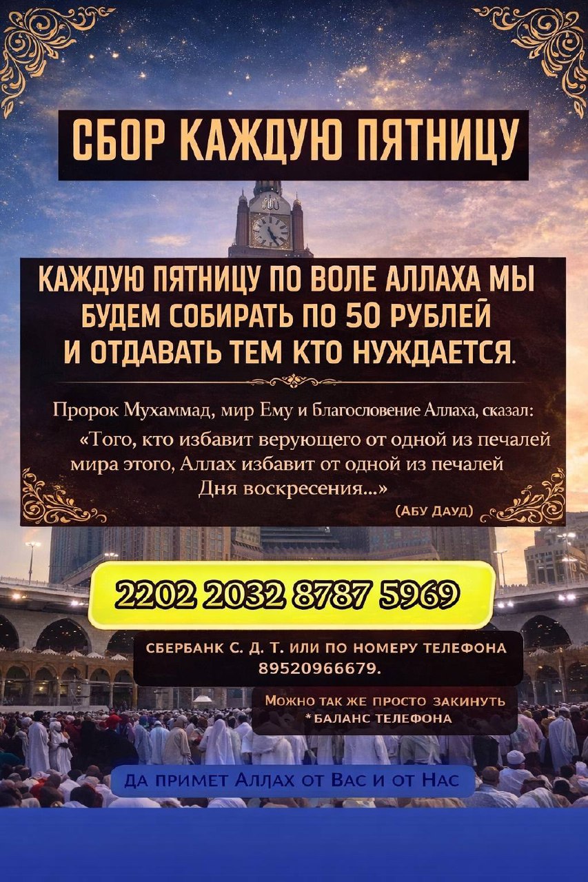 С Именем Аллаха Милостивого Милосердного, мы открываем сбор, для сирот, больных детей (Исцелит их Аллах),требующих знания и тд. Да Воздаст Аллах благом каждому, кто принимает участие в этом благом деле, сбор будем проводить каждую пятницу по воле Всевышнего.