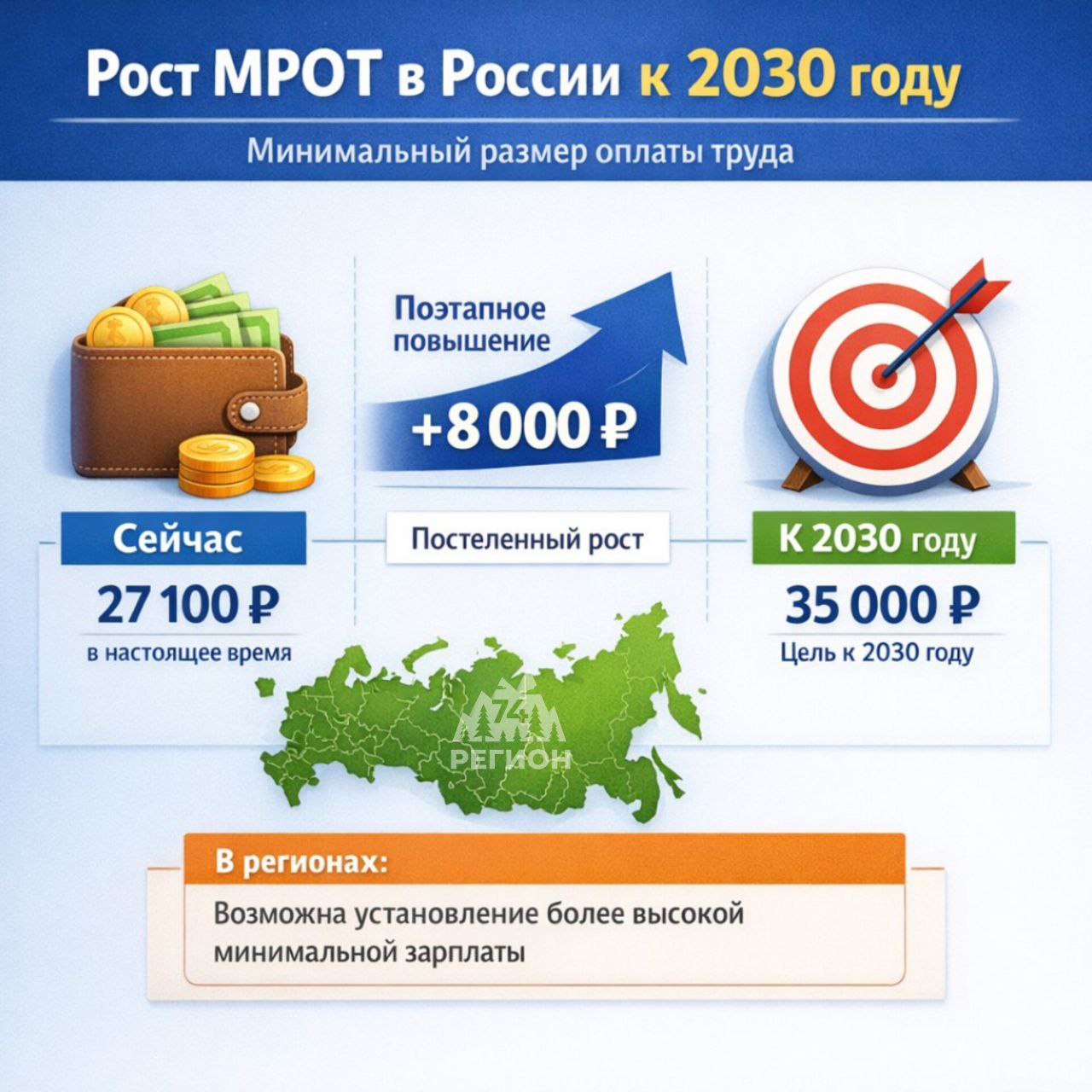 Поэтапное повышение, предусмотренное планом, позволит увеличить его на 8 тысяч рублей к концу десятилетия. В регионах возможно установление более высокой минимальной зарплаты.