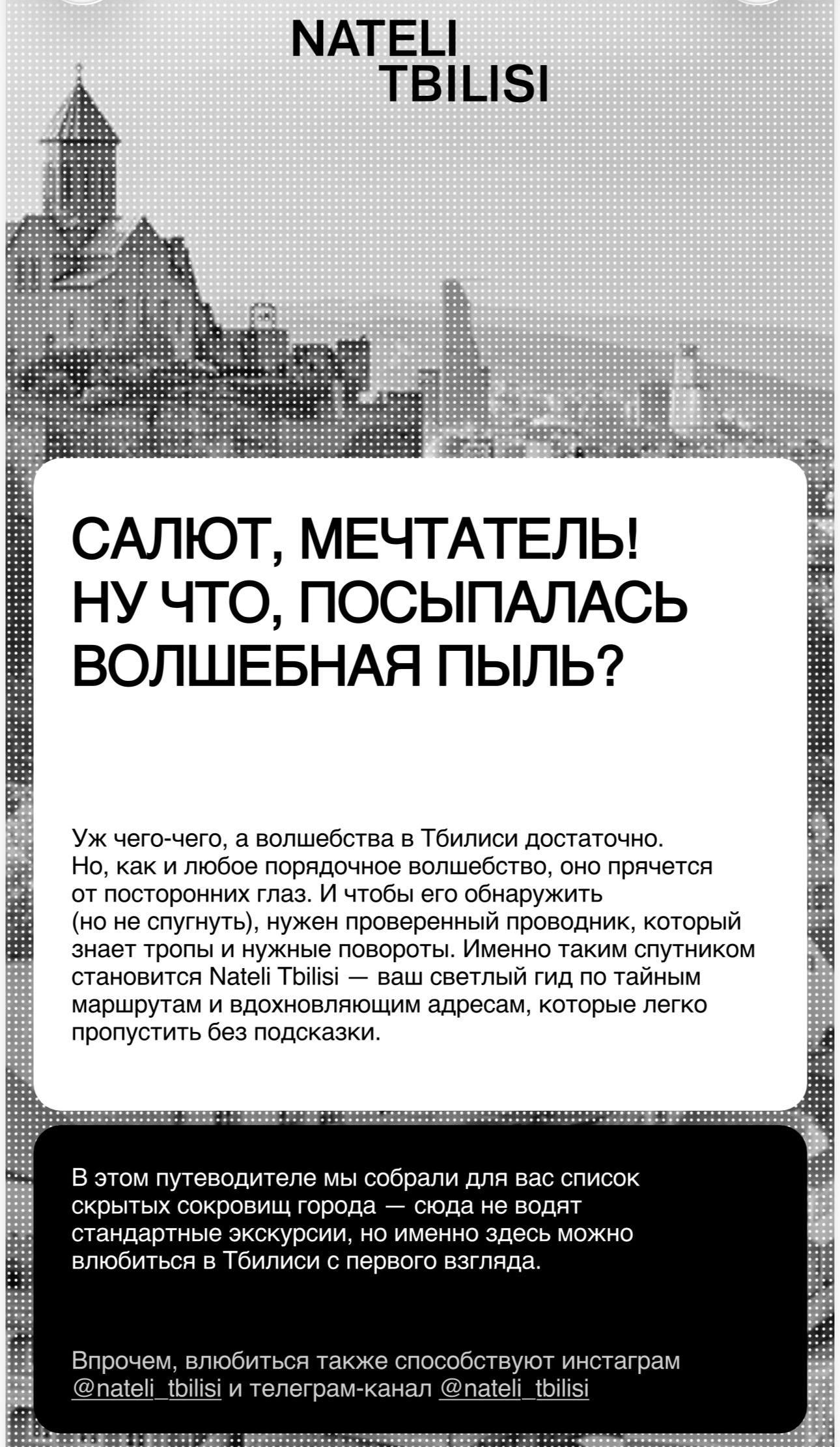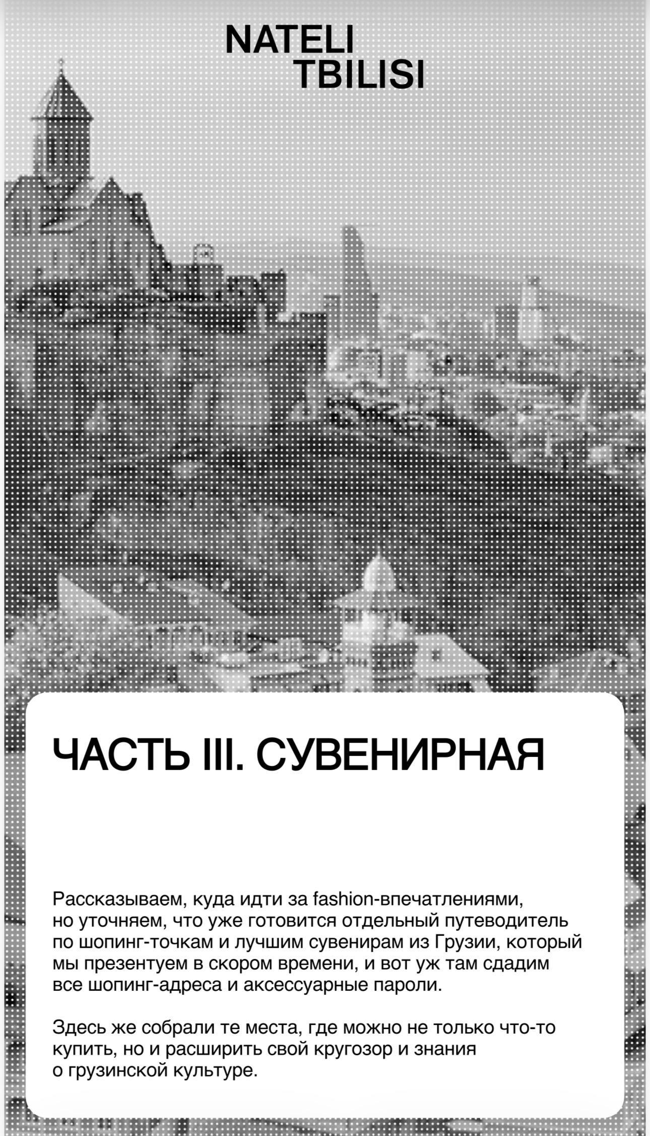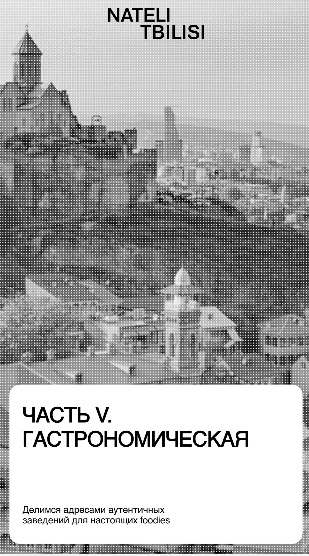 Это первая глава нашего большого замысла — совсем скоро мы выпустим арт-гид по Тбилиси, шопинг-гид и другие путеводители, которые команда Nateli Tbilisi уже давно собирает по крупицам.
