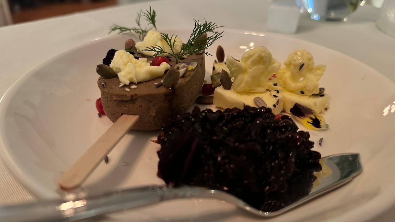 Паштет из куриной печени. Закуска, похожая на десерт. Фигурное сливочное масло, ягодный джем. Очень сбалансированно и действительно пробуждает аппетит. Нам порекомендовали в пару к нему вино сорта киси винодельни Бабанеури — и это был отличный совет.