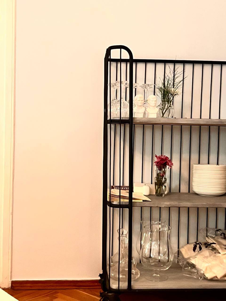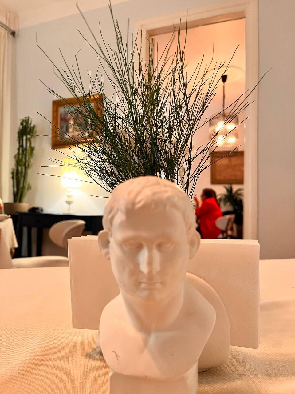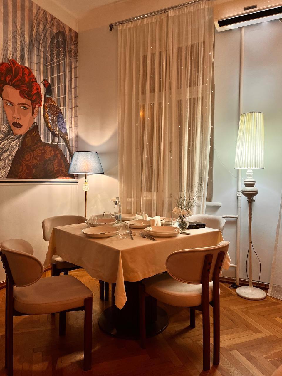Интерьер ресторана оказался обманчив. Театральные маски, дерево в отделке, белые скатерти, кованые детали, антиквариат, негромкая классическая музыка настраивали на спокойную элегантность. И наряду с этим — китчевое панно во всю стену, гротескный интерьер уборной (сами увидите, не будем портить сюрприз). На лестнице обращаем внимание на светящегося Христа с надписью «Я всё видел!». Официант смеётся: неоновую фигуру однажды принёс шеф, никому ничего не сказав. Кажется, ироничные детали всё-таки складываются в картину вполне запланированного хулиганства, будто мы попали в квартиру эксцентричного человека.