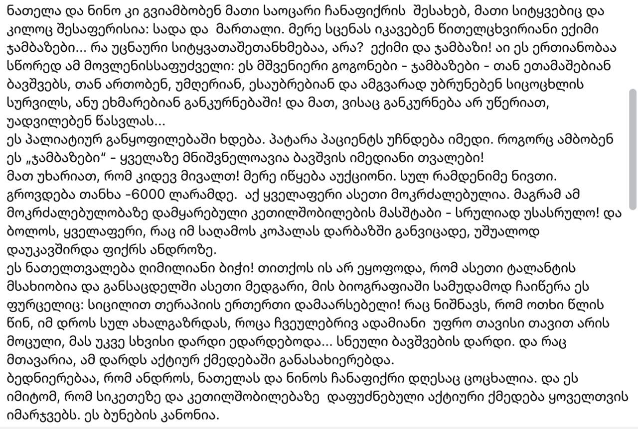 Счастье, что замысел Андро, Нателы и Нино жив и сегодня. И это потому, что активное действие, основанное на добре и благородстве, всегда побеждает. Таков закон природы...»