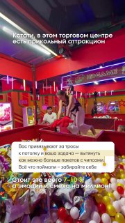 Вас привязывают за тросы к потолку и ваша задача — вытянуть как можно больше пакетов с чипсами. Всё что поймали – забирайте себе🤩
