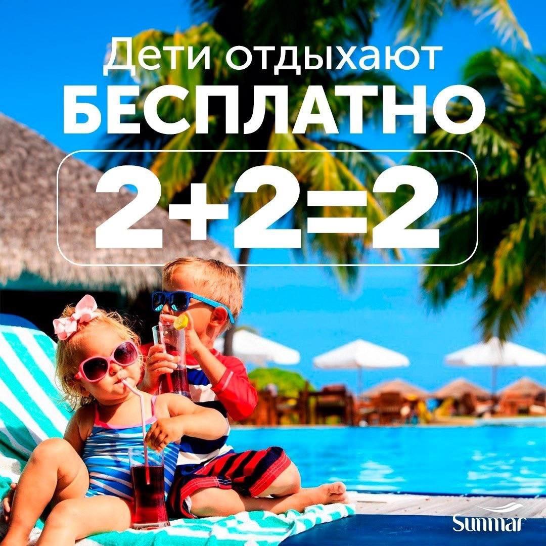 🔥 ГЛАВНАЯ ВЫГОДА: Акция «2+2 = 2». В ряде отелей двое детей проживают бесплатно! Вы платите только за их перелет и страховку. Это колоссальная экономия для больших семей.