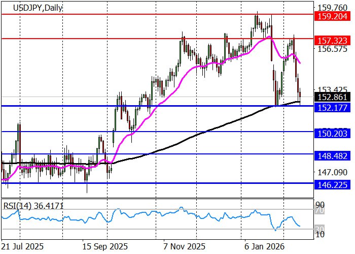 Среднесрочный тренд разворачивается вниз, и цена движется ниже ключевой области поддержки 153.95–153.43: если неделя закроется ниже неё, изменение тенденции будет подтверждено, и с понедельника станут актуальны короткие позиции с целями в зоне 2 (148.82–148.33), однако в случае возврата на ключевой уровень поддержки стоит открывать длинные позиции с целью 156.44.