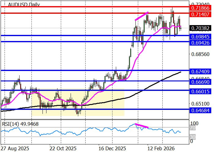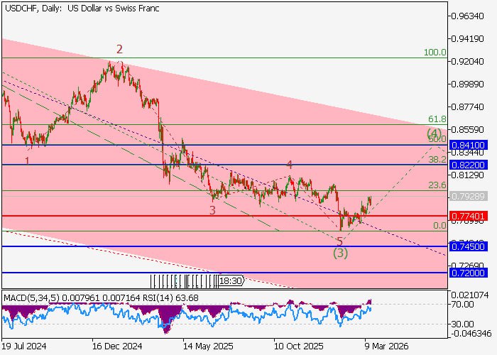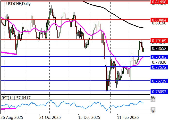 Долгосрочный тренд сменился на восходящий при закреплении цены выше февральского пика 0.7818, и после формирования уровня сопротивления 0.7917 началась коррекция к уровню поддержки 0.7818, где станут актуальны длинные позиции с целями 0.7917 и 0.7987 (EMA (190)), однако в случае преодоления этой отметки вероятно снижение в район 0.7757.