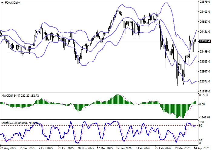 Цена торгуется вблизи EMA 21 и EMA 190, тогда как индикатор RSI (14) заходил в область перекупленности в марте, но к настоящему моменту покинул её пределы и сейчас находится в нейтральной зоне, позволяя рассматривать позиции в обоих направлениях.
