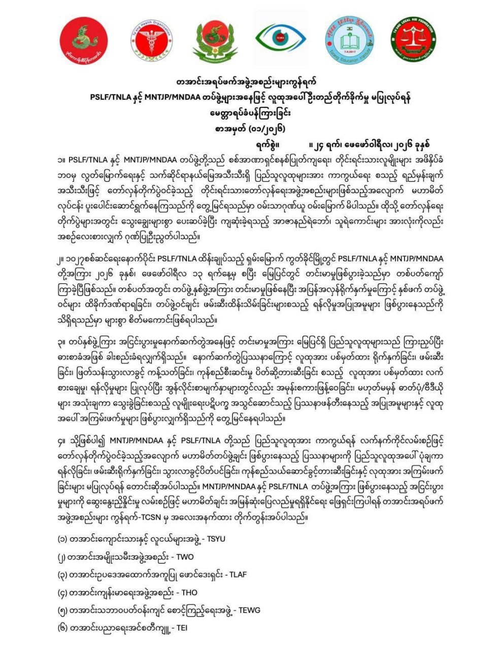 ရှမ်းပြည်နယ်မြောက်ပိုင်း၊ ကွတ်ခိုင်မြို့နယ်အတွင်း တအာင်းအမျိုးသားလွတ်မြောက်ရေးတပ်မတော် (TNLA) နှင့် မြန်မာ့အမျိုးသားဒီမိုကရက်တစ်မဟာမိတ်တပ်မတော် (MNDAA) တို့ကြား မြေပြင်တင်းမာမှုများ ဖြစ်ပွားနေခြင်းကြောင့် ဒေသခံပြည်သူများအပေါ် လူ့အခွင့်အရေးချိုးဖောက်မှုများ မပြုလုပ်ရန် တအာင်းအရပ်ဘက်အဖွဲ့အစည်းများကွန်ရက် (TCSN) က ယနေ့ တောင်းဆိုလိုက်သည်။