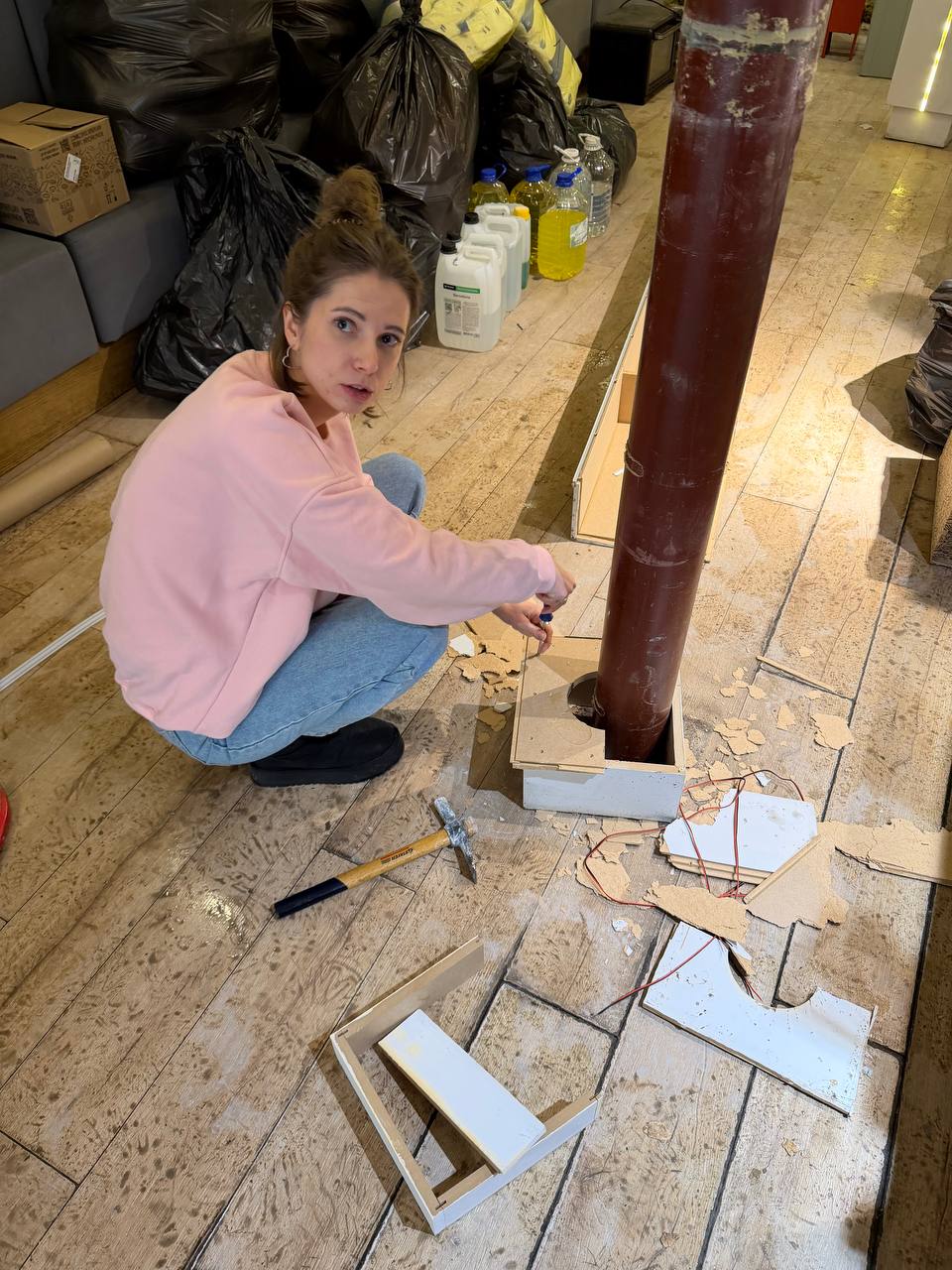 В итоге детям было весело и по началу подозрительно что ли. Ничесе, не каждый день тебе дают разрисовать стены, а затем уничтожить их топорами-молотками. Но за рамки дозволенного не заходили, крушили только то, что было ОК.