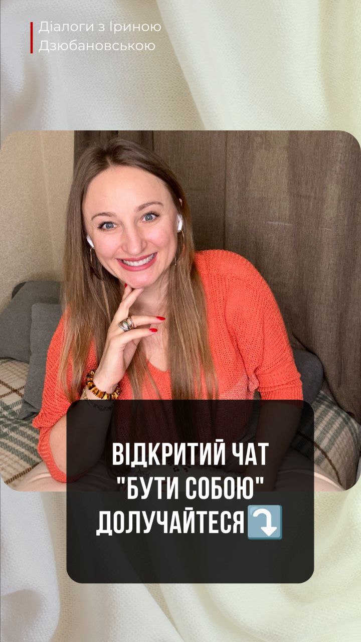 👆Запрошую вас в мій відкритий чат «Бути собою. Діалоги з Іриною Дзюбановською», де щосуботи на відкритих зустрічах ми говоримо про життєві теми, про наші стани, про внутрішні діалоги і поступово вчимося найважливішому — бути собою ❤️