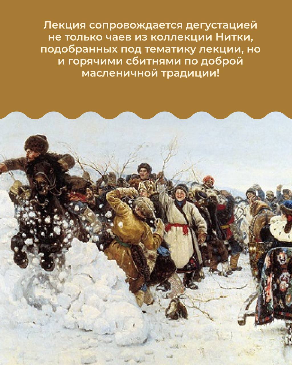 Масленичная неделя пройдет уже с 16 февраля по 22 февраля, и мы приглашаем вас на тематические лекции-чаепития от нашей Чайной школы – тёплые встречи за большим чайным столом со скатертями, блинами и горячими сбитнями.
