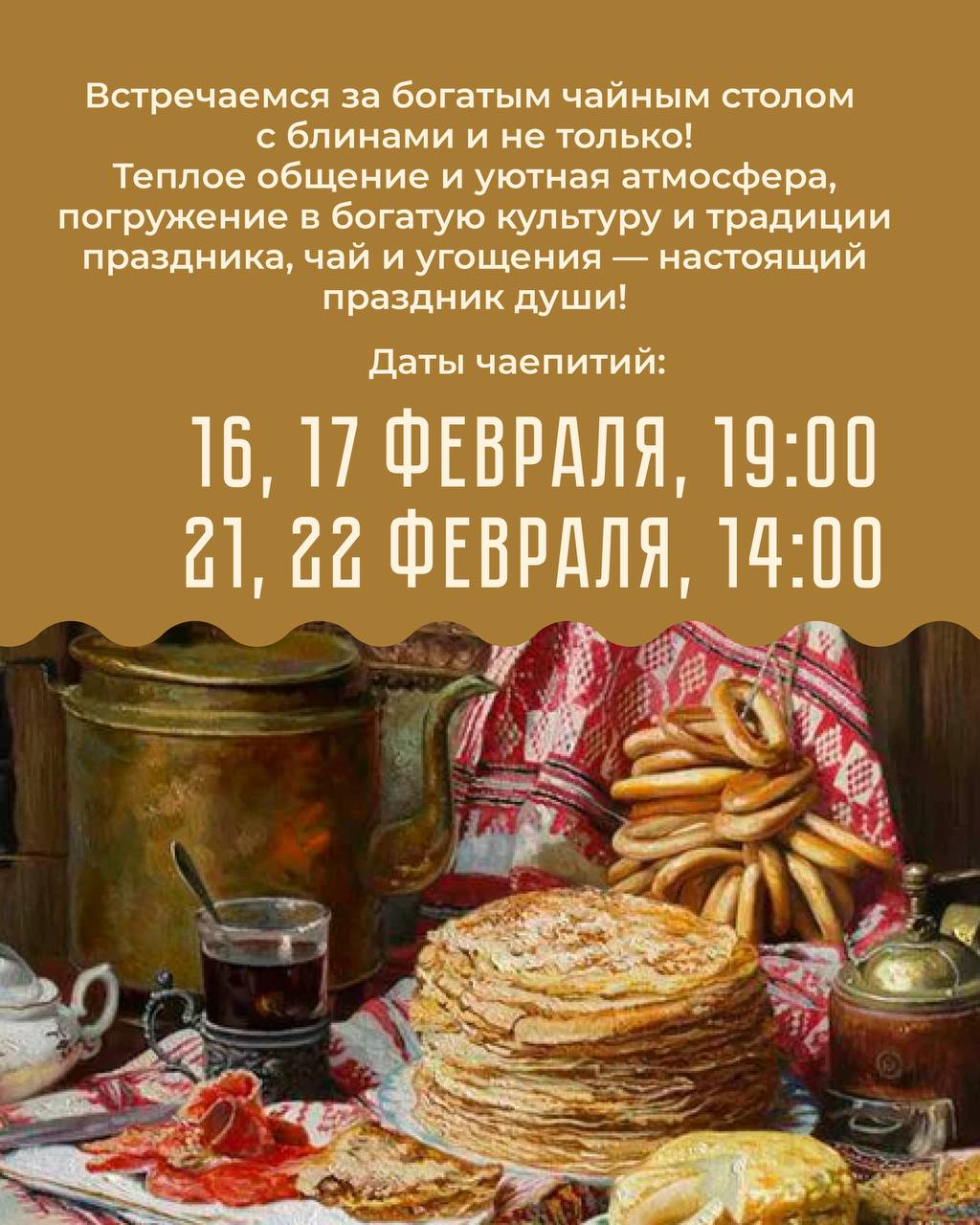 Встречаемся за богатым чайным столом с блинами, традиционными угощениями, а также горячими сбитнями по доброй масленичной традиции!